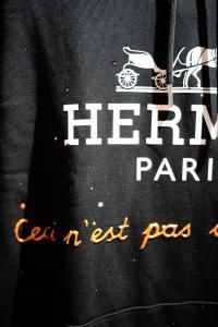 大量生産されるメゾンブランドへの風刺。キャンバスのように手描きの作品を創り、サインとシリアルナンバーが付けられている。