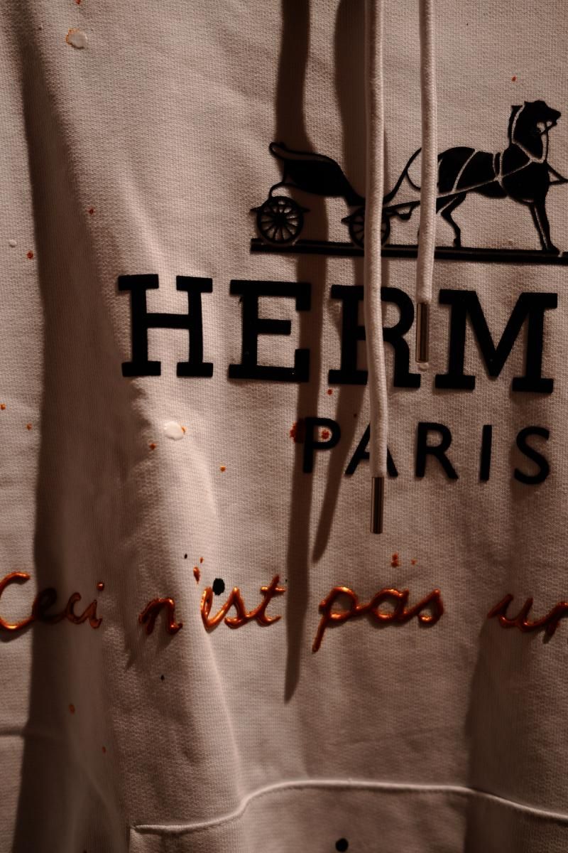 大量生産されるメゾンブランドへの風刺。キャンバスのように手描きの作品を創り、サインとシリアルナンバーが付けられている。
